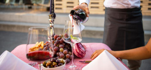 Tischtuch und Kerzenständer Variantikum - Wein und Gläser - Vinothek Josef - div. Delikatessen: l‘Italiano - Menü, Geschirr und Kellner: Theater Casino