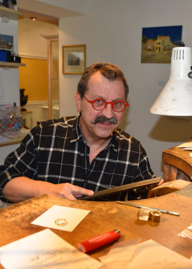 IchbindamalsindiesenBerufhineingerutscht.DurchmeinenVaterkonnteichbeimJuwelierBinderinZüricheineSchnupperlehremachen. BinderwarzudieserZeiteinerderbestenAdresseninderSchweizunddieArbeithattesofortfürmichgepasst.AlsLehrmeisterwarHerr Binder Senior wirklich hervorragend, auch wenn er menschlich nicht immer ganz so einfach war.Wie würden Sie Ihre Kunden beschreiben?MeineKundenkommenvonüberallher.Vielekenneichauchnochvonmeiner Altgold-Zeit.DamalswarichzweimalimFernsehen,wasmir eine grosse Publicity einbrachte. Heute liegt mein Fokus aber primär auf der Goldschmiedearbeit.MeineKundschaftistvomAlterhereherab40aufwärts.DerStellenwertdesechtenGoldschmuckeshatsichindenletztenca.20-30Jahren starkverändert,vorallembeimjüngerenPublikum.DashatsicherlichauchmitdemPreisundvermutlichdemüberreichenAngebotan Modeschmuck zu tun. Die einzige Ausnahme sind da Eheringe, die werden immer noch praktisch nur aus Gold angefertigt. Warum sind Sie in Zug und speziell in der Zuger Altstadt?AuchbeiderWahlmeines Arbeitsortsschätzeichdie AbwechslungundsobinichnichtderTyp,derewiganeinenOrtgebundenist.Hierin derZuger Altstadtgefälltesmiraberschonsehrgut.Dasauch,weildieUmgebungwirklichschönist.Dassichaberhiergelandetbin,warein reiner Zufall. Davor war ich 17 Jahre in Affoltern.